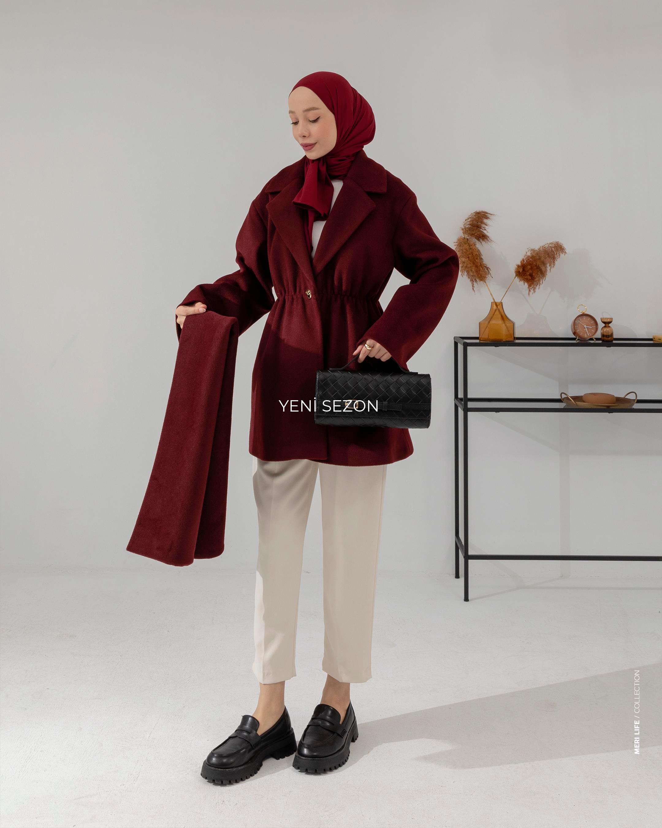 Atkı Detaylı Beli Lastikli Bordo Kaşe Ceket