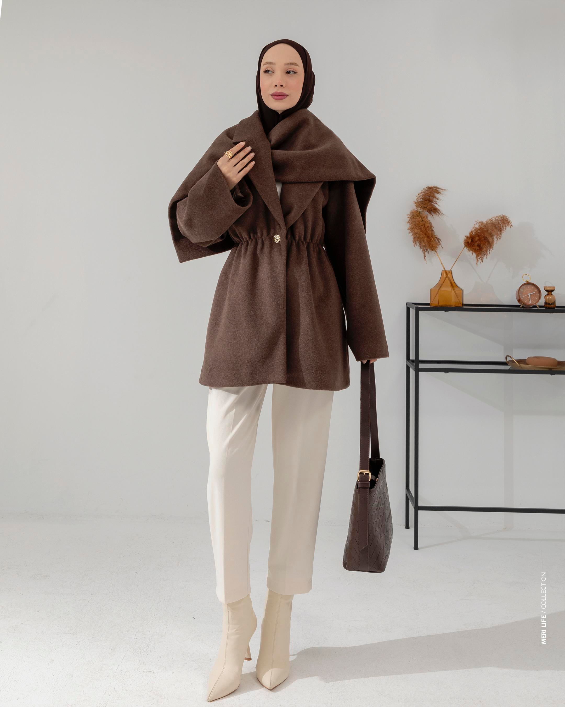 Atkı Detaylı Beli Lastikli Kahve Kaşe Ceket