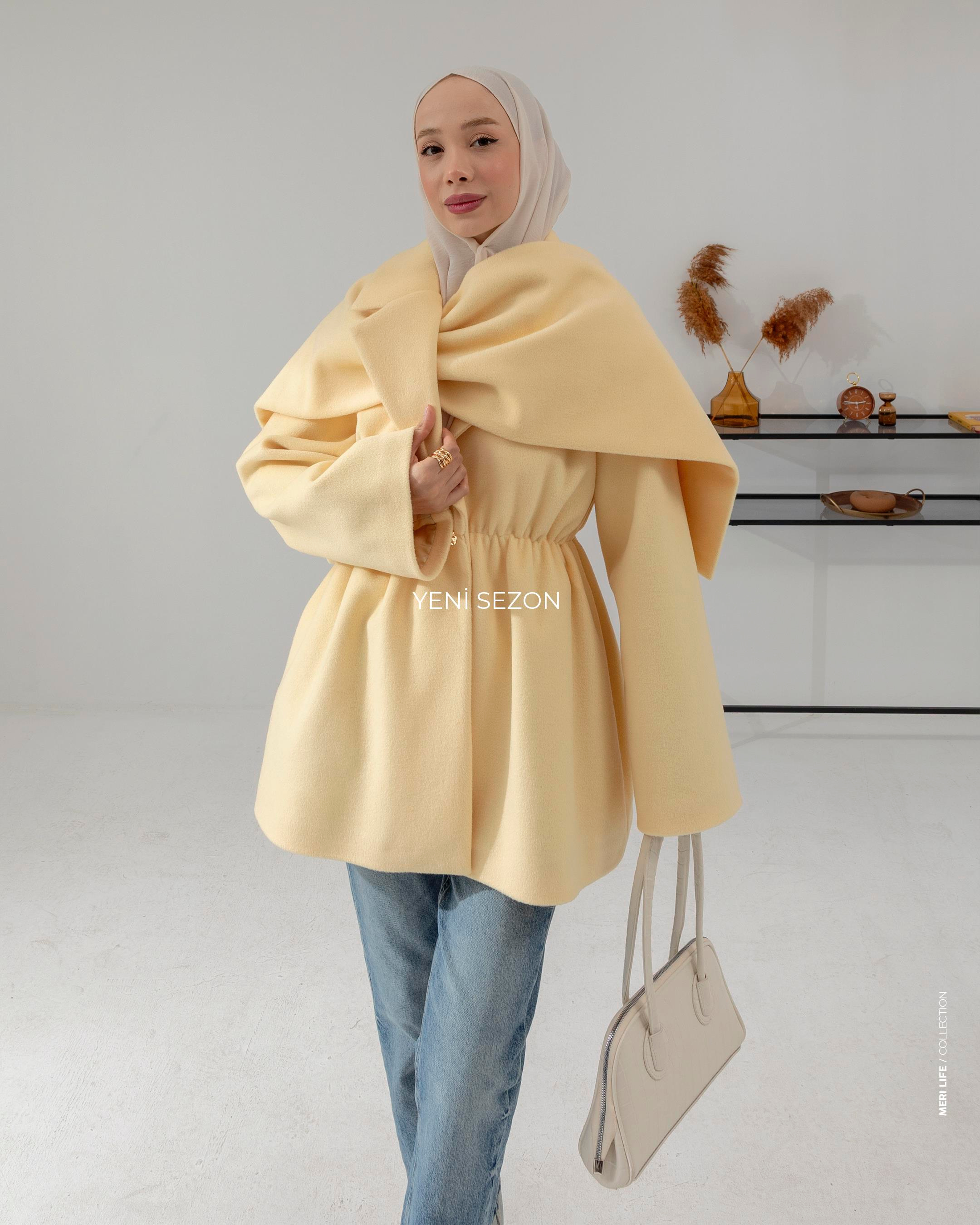 Atkı Detaylı Beli Lastikli Sarı Kaşe Ceket