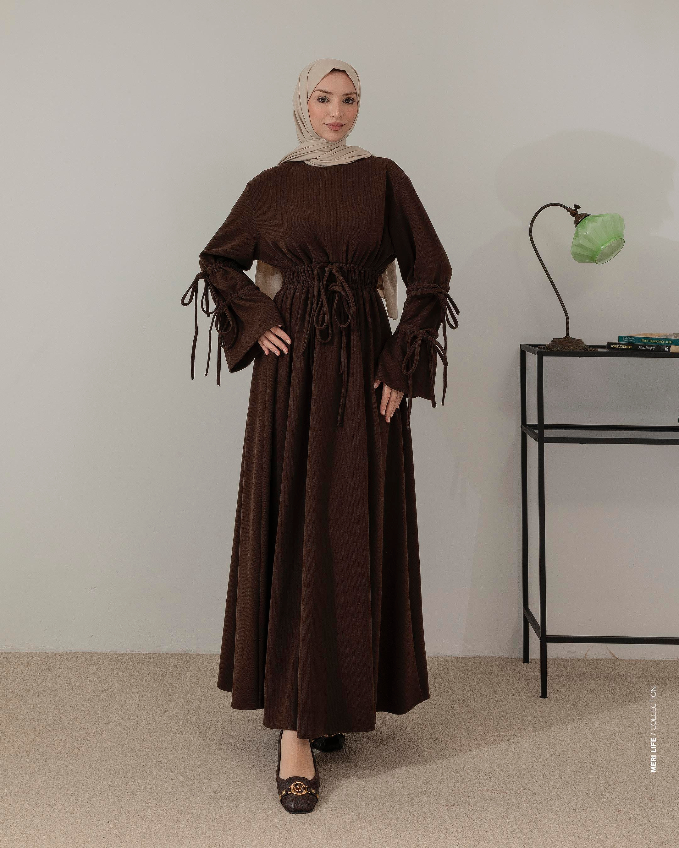 Bağcık Detaylı Fitilli Kahve Elbise