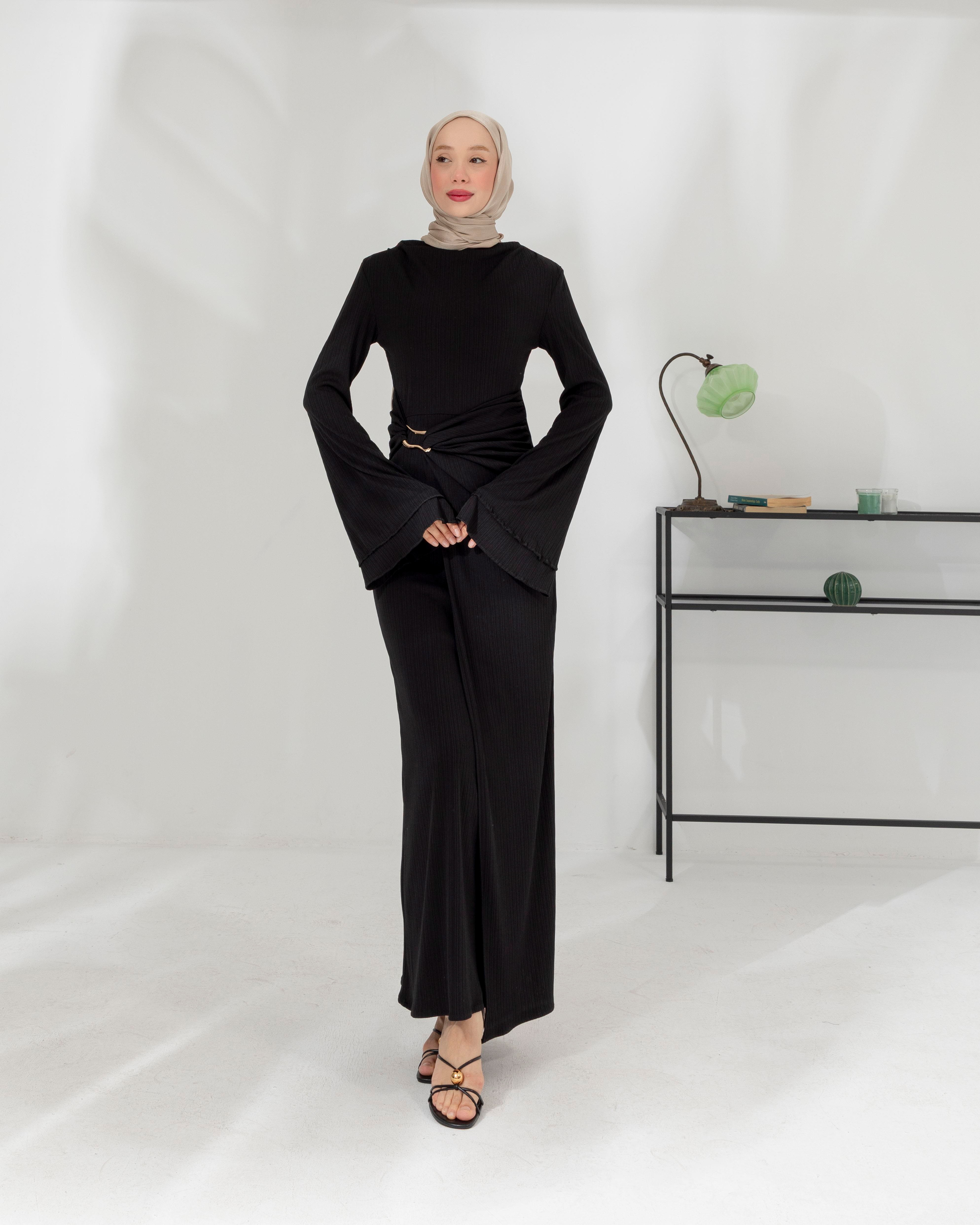 Eteği Kat Detaylı Fitilli Siyah Elbise