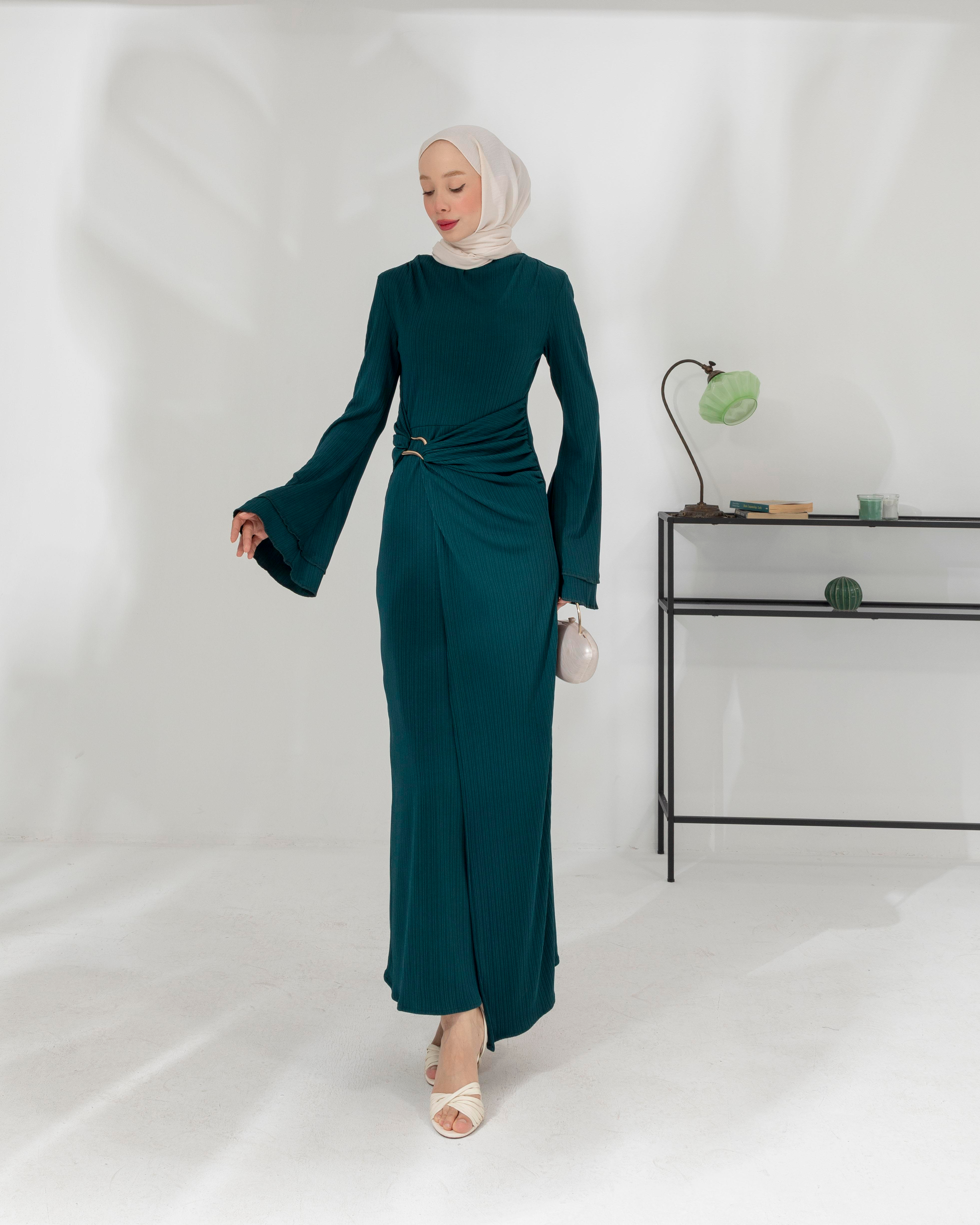 Eteği Kat Detaylı Fitilli Zümrüt Yeşili Elbise
