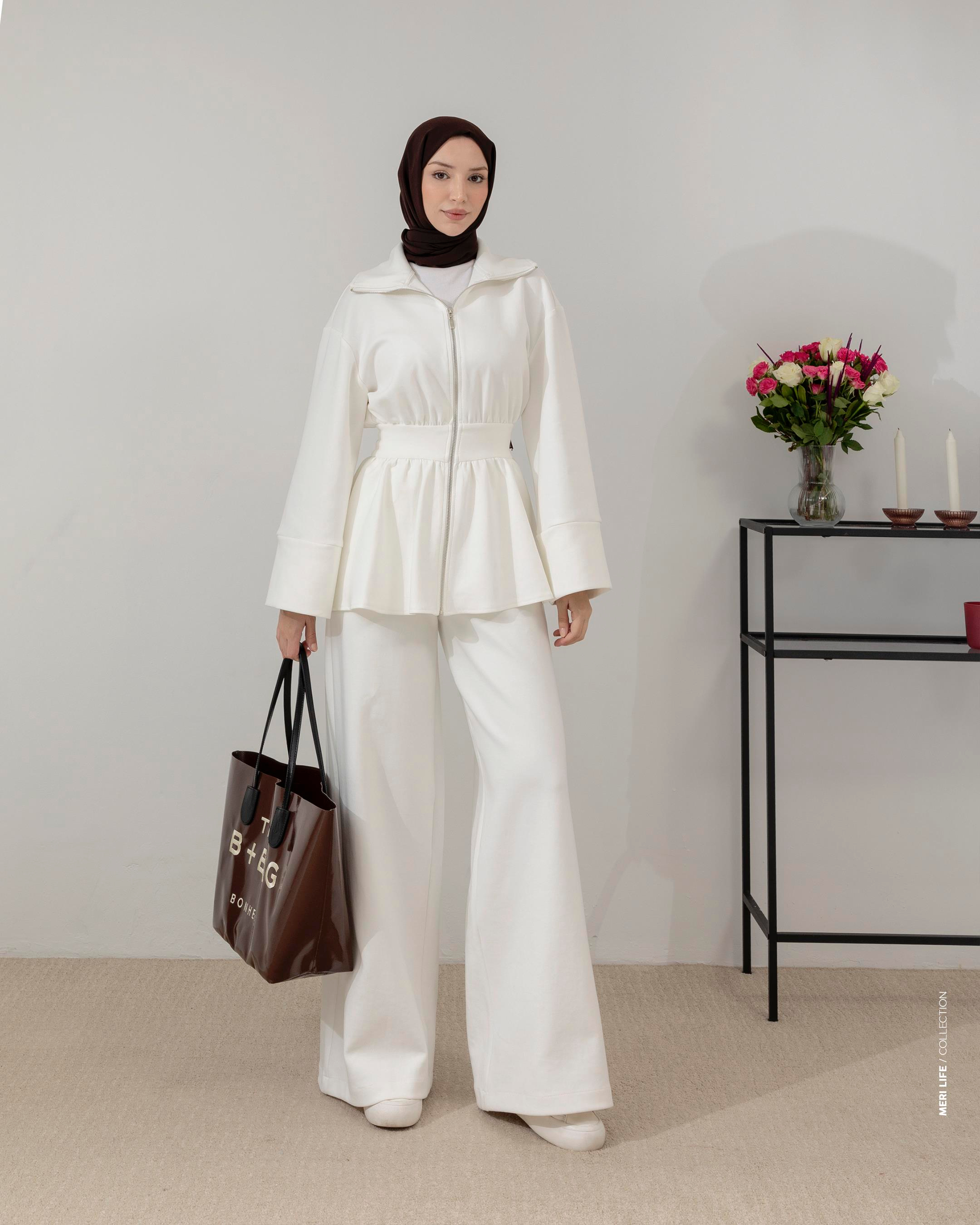 Fermuarlı Sweat Pantolon Beyaz Takım