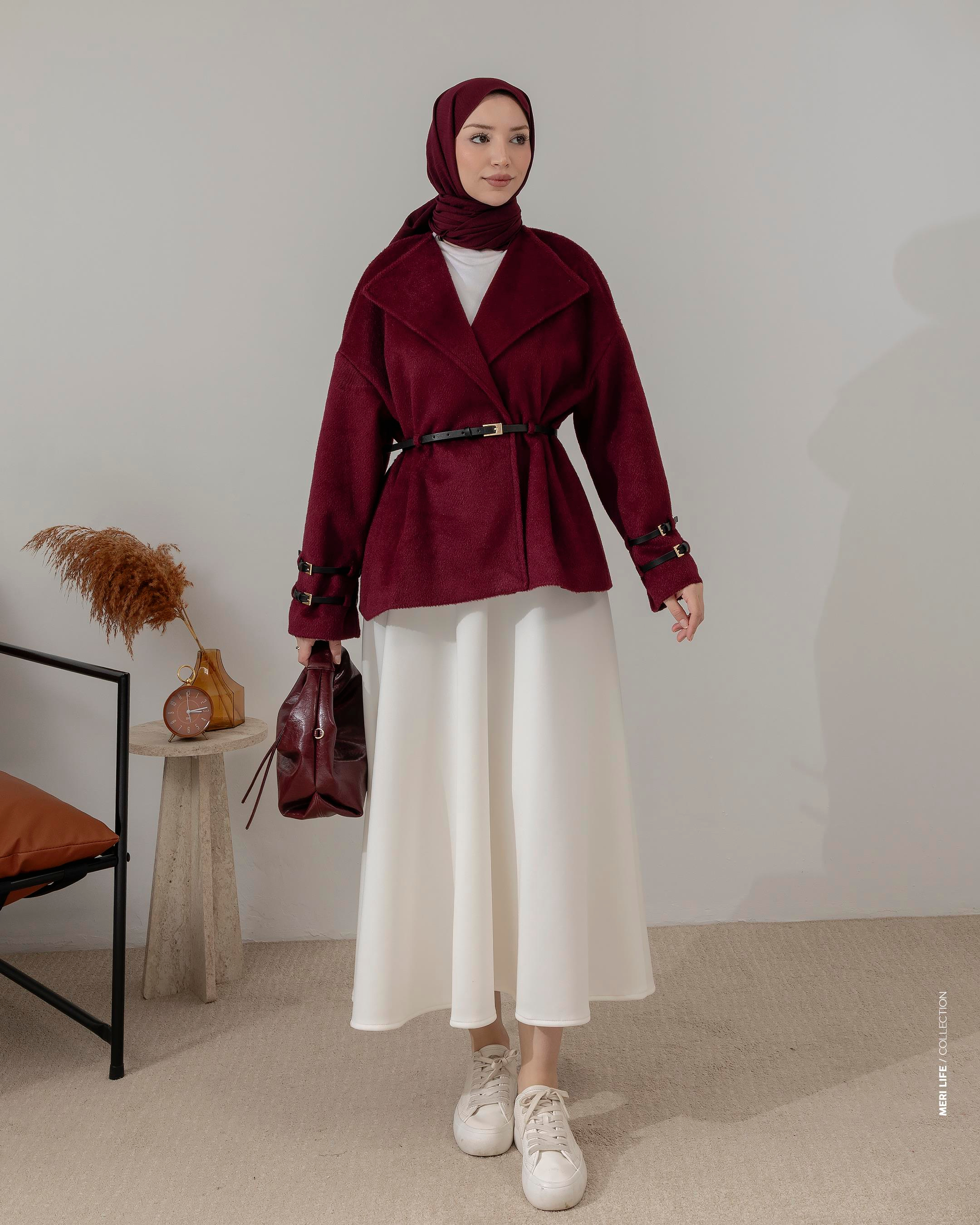 Kemer Detaylı Bordo Kaşe Ceket