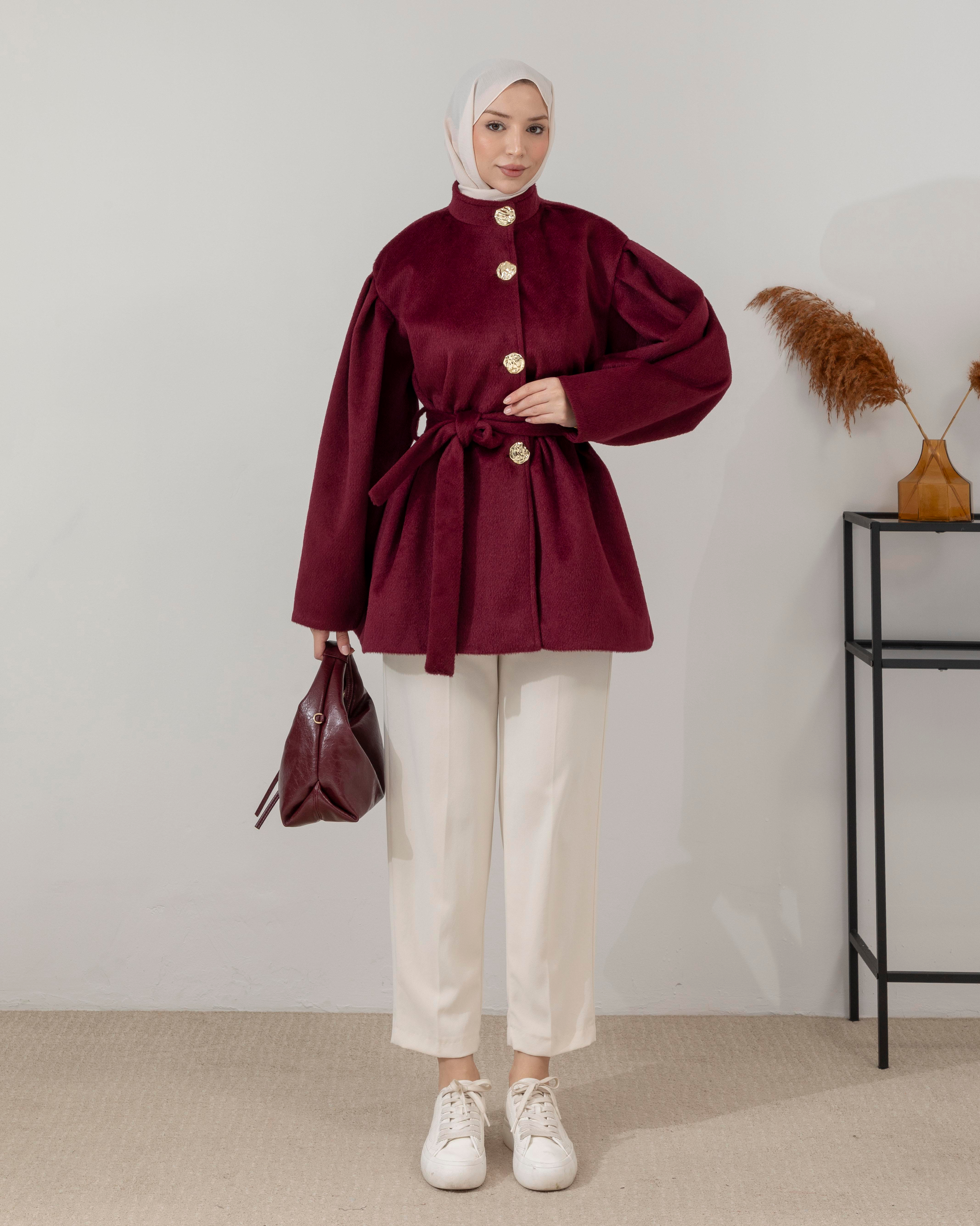 Omuz Pileli Bordo Kaşe Kaban