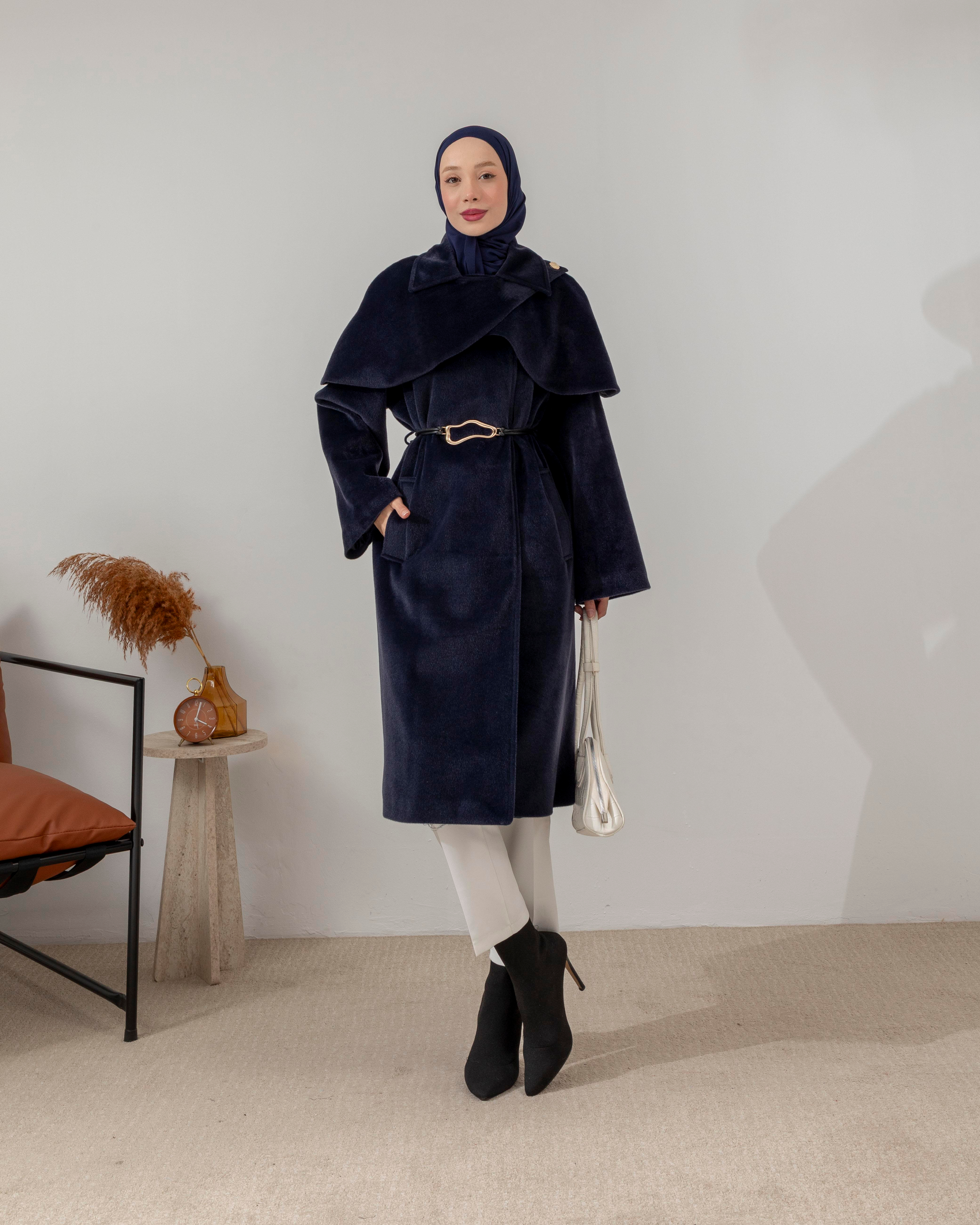 Pelerin Detaylı Lacivert Kaşe Kaban