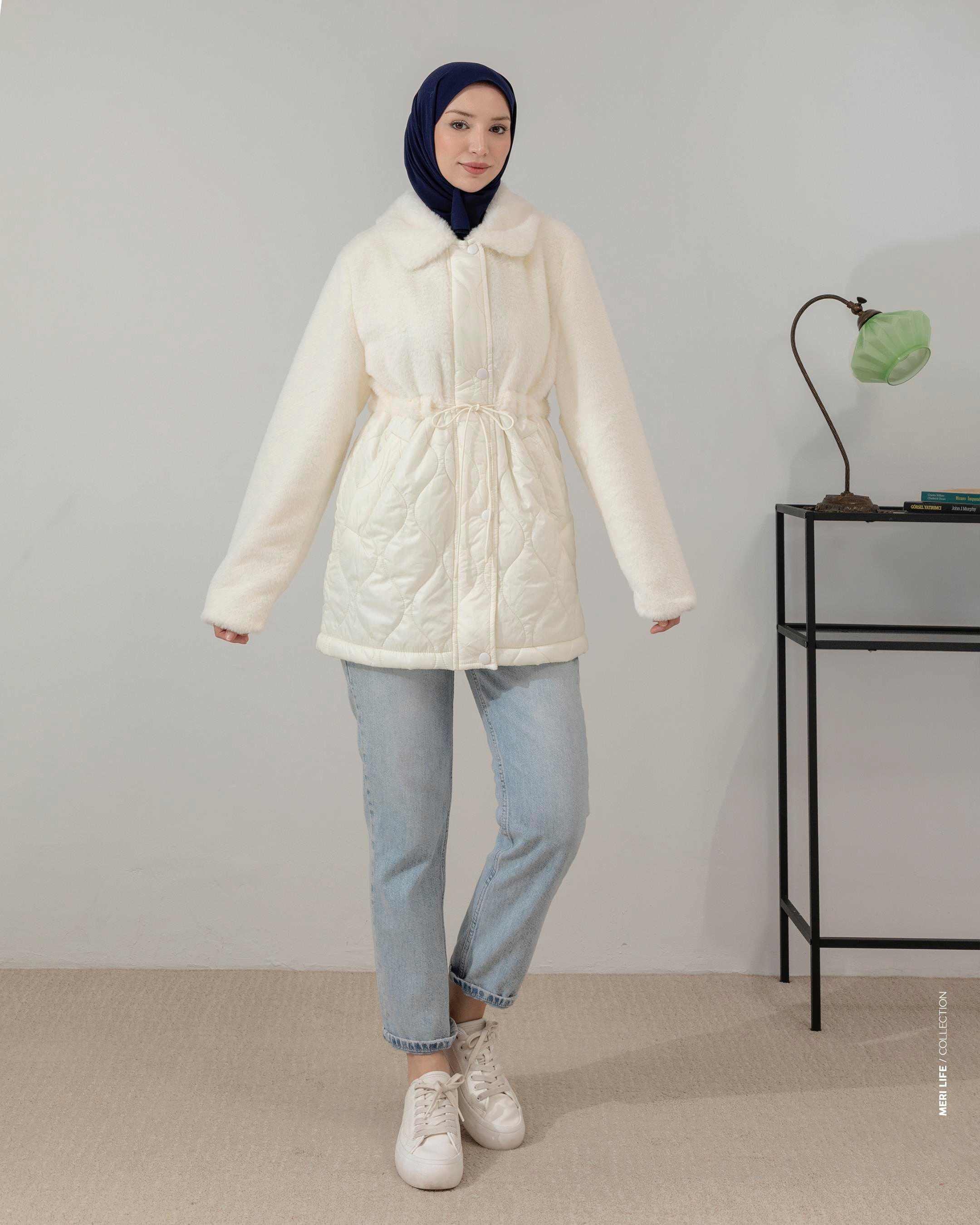 Peluş Garnili Kapitone Ekru Mont