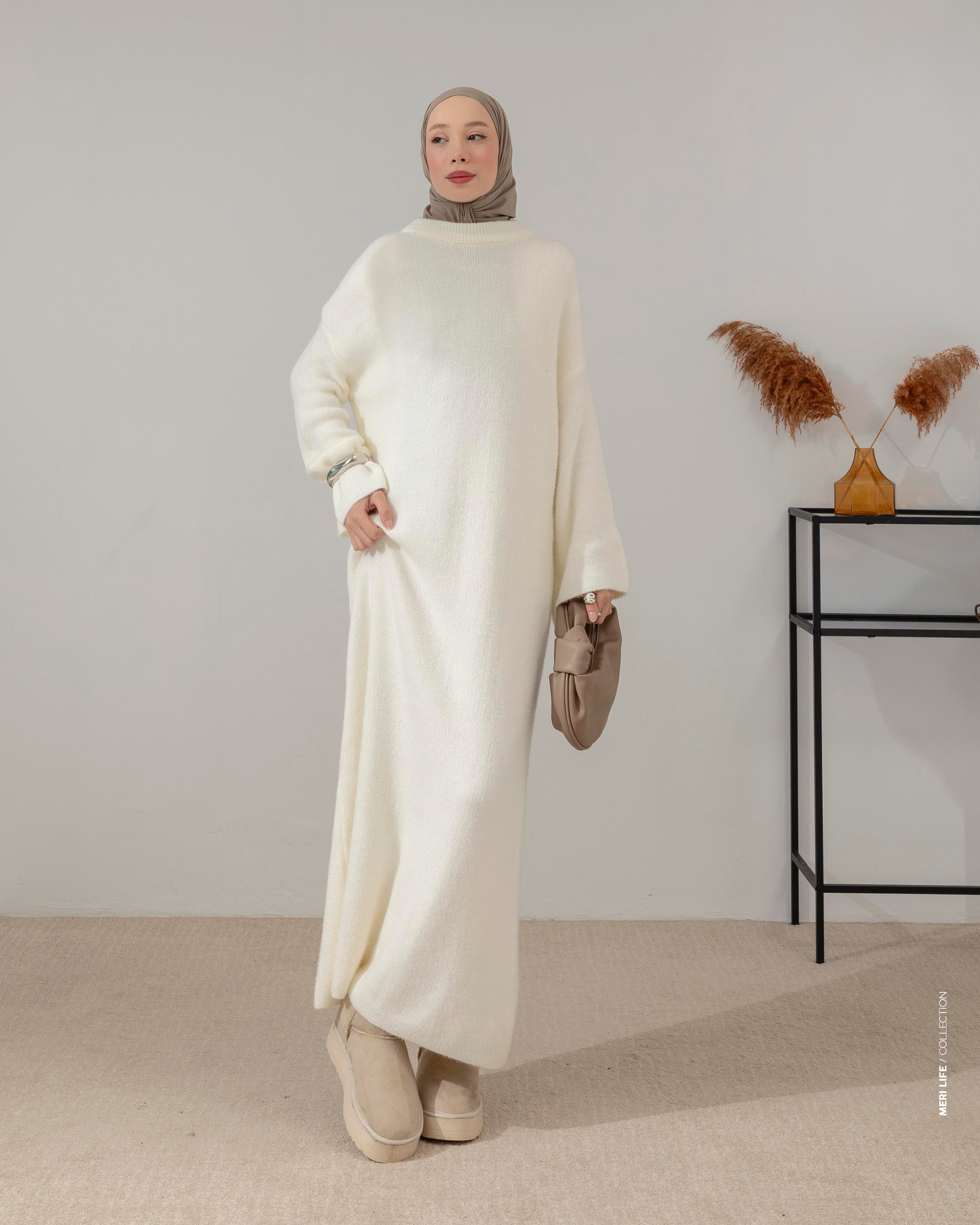 Tüylü Dokuma Ekru Elbise